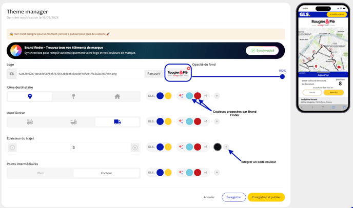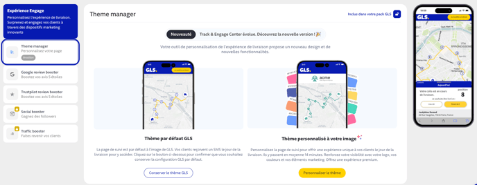 Grâce au Thème Manager, vous avez la possibilité de personnaliser l'aspect de la page de suivi géolocalisée, accessible à tous les destinataires livrés par GLS, pour qu'elle reflète parfaitement l'image de votre marque.