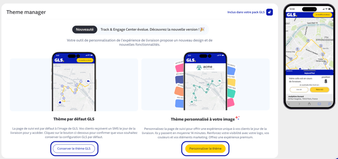 Vous avez la possibilité de choisir entre deux options de personnalisation- Conserver le thème GLS : maintenir une page de suivi aux couleurs de GLS